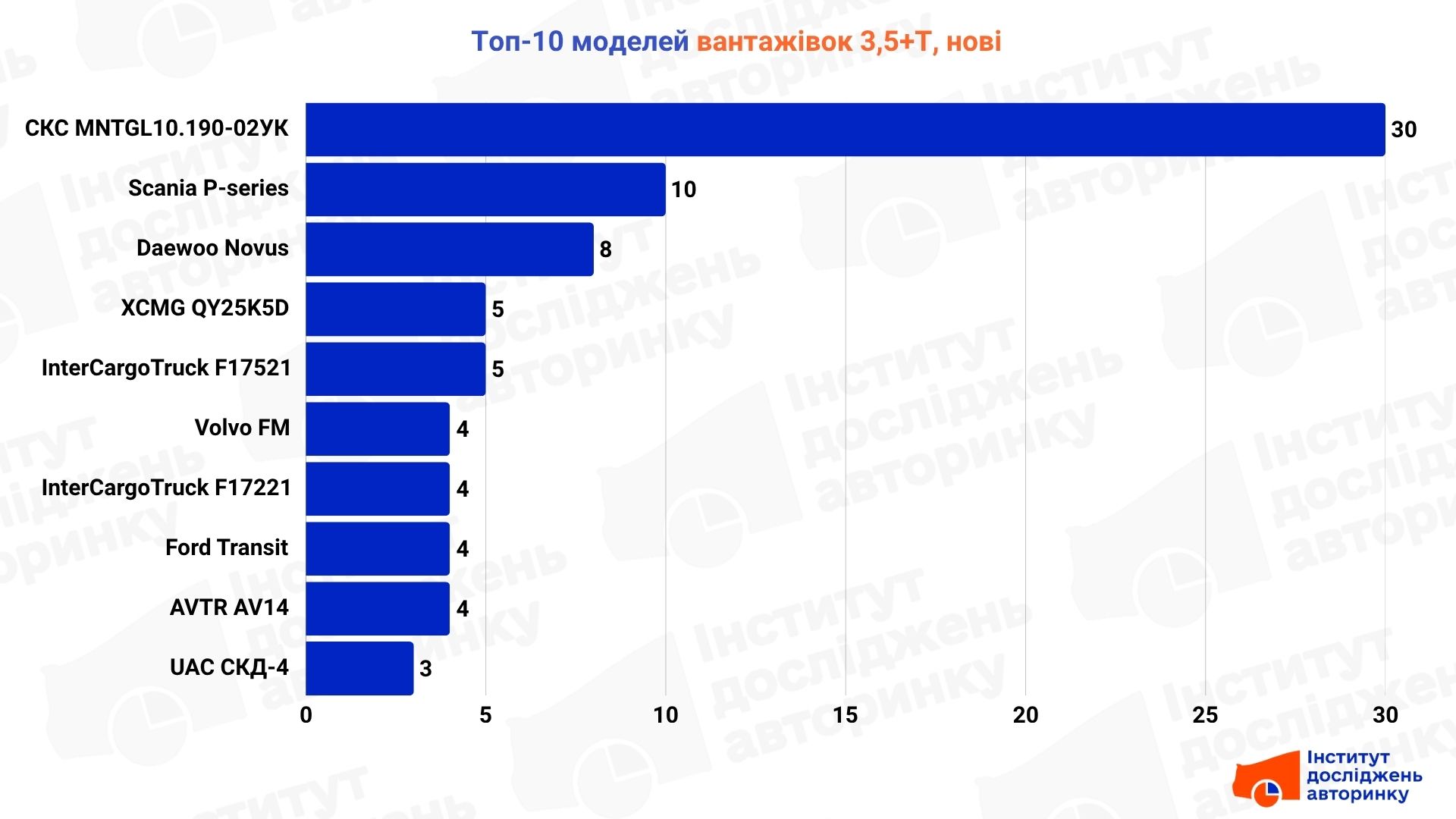 Among the new trucks registered last month, brands unfamiliar to the general public dominate — mostly these are chassis of foreign origin, which after retrofitting in Ukraine receive completely different names. More precisely — indices with a different set of symbols. This time the first place goes to a van with a tail lift from Spetskomservis (SKS) based on the MAN TGL. Next on the list are Scania P-series, and Daewoo Novus — dump trucks, a batch of which was purchased in Khmelnytskyi.