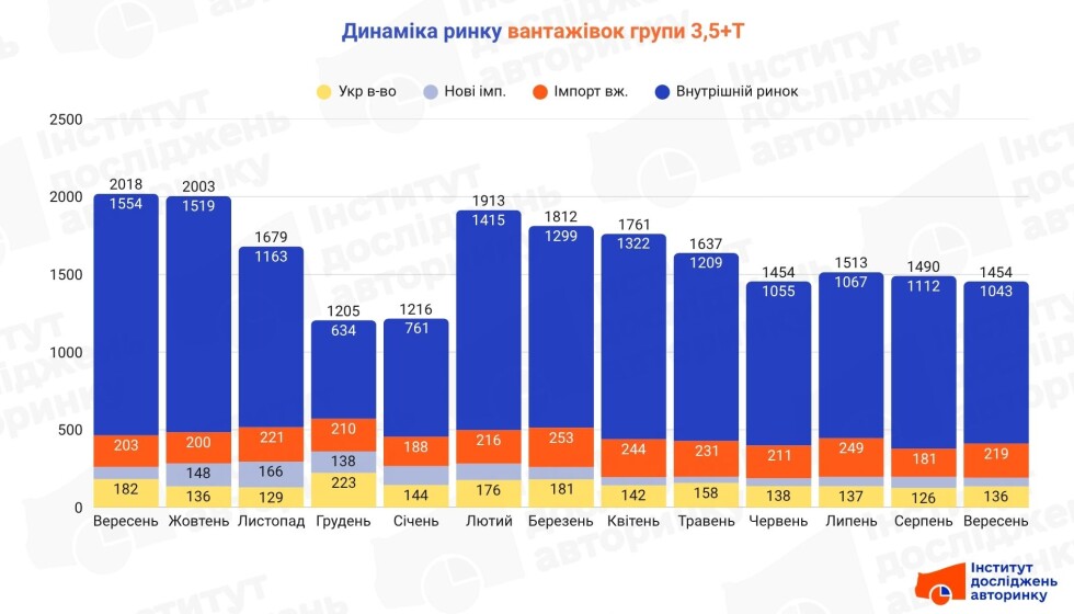 The market volume of trucks with a gross weight of over 3,500 kg as of September 2025 amounted to 1,454 units. Compared to August of the same year, this is 2.4% less, and also 27.9% less compared to the results of September 2024. Monthly volumes are shown in the diagram.