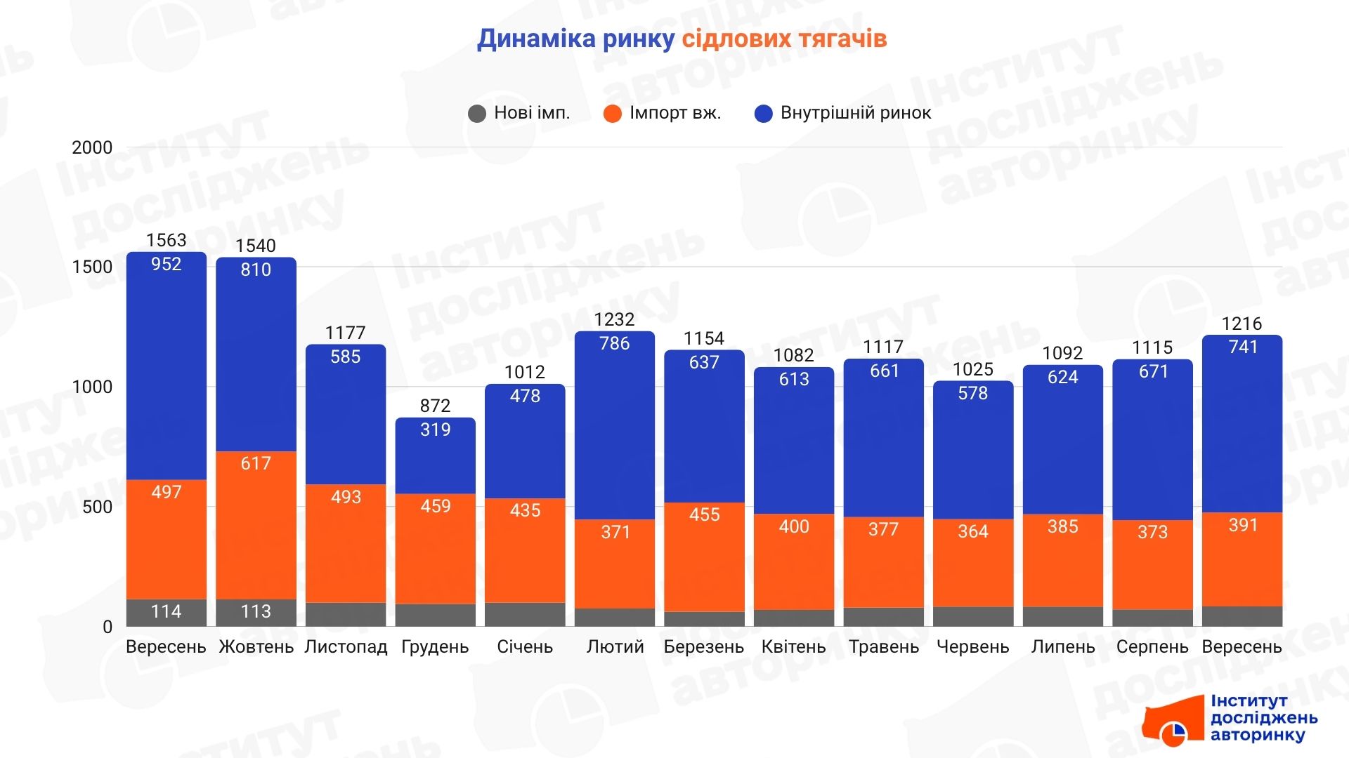 During September 2025, Ukrainians purchased a total of 1,216 new and used tractor units. This figure is 22.2% lower compared to the results of the same period in 2024, but 9.1% higher compared to August of this year.