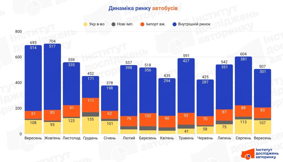 During September 2025, Ukrainian carriers purchased 507 new and used buses. This is 16.1% less compared to August of this year, and 26.8% less compared to September 2024.