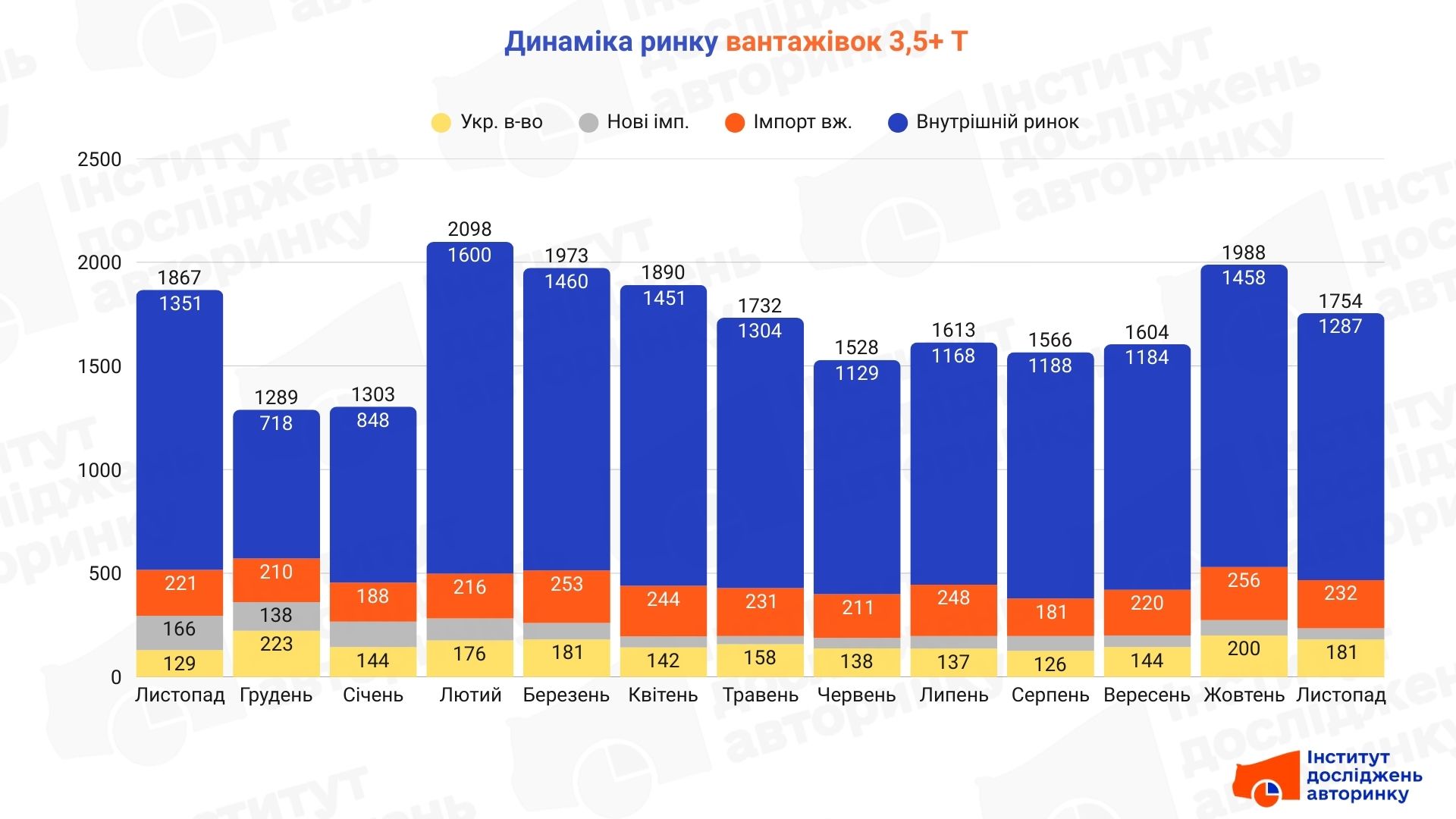 The market volume of trucks with a gross weight of over 3,500 kg as of November 2025 amounted to 1,754 units. Compared to October of the same year, this is 11.8% less, and also 6.1% less compared to the results of November 2024. Monthly volumes are shown in the diagram.