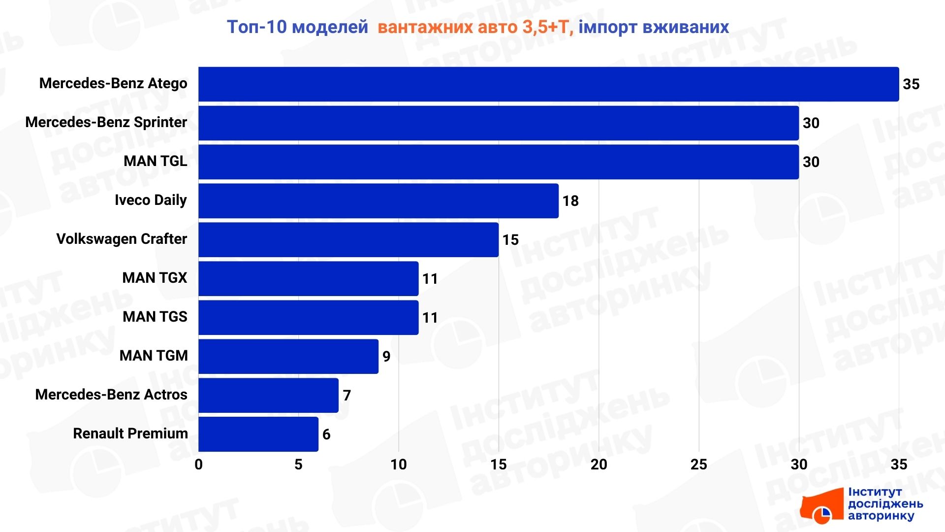 If the domestic market resembles an exhibition of achievements of the Soviet economy, then the list of imports is a showcase of German engineering. Ukrainian business, choosing equipment for long-term work, votes with its wallet exclusively for reliability. There are practically no random guests in the Top 10 — almost the entire rating was divided between two giants: Mercedes-Benz and MAN.