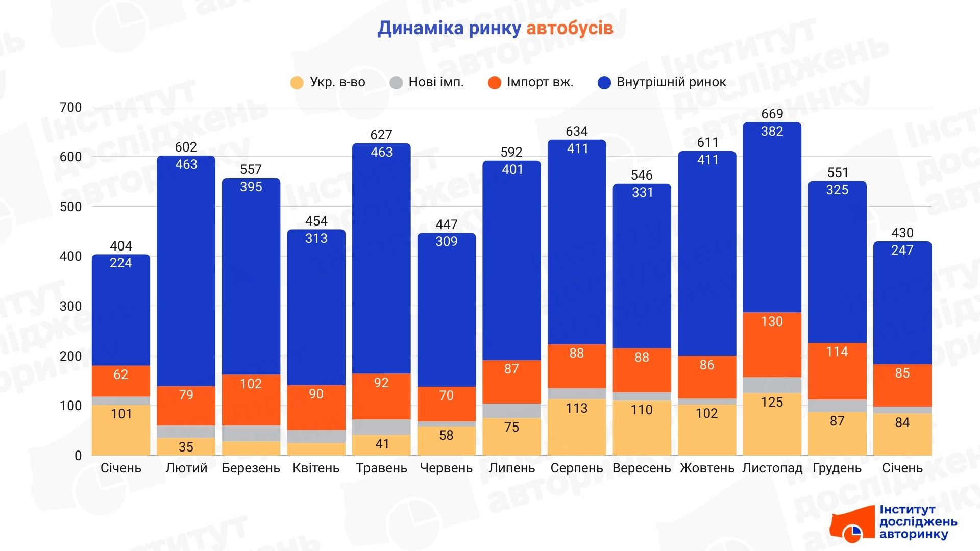 Минулого місяця на внутрішньому ринку було укладено 247 угод купівлі-продажу. Сегмент імпорту вживаної техніки поповнився на 85 одиниць, а нових автобусів було зареєстровано 98 штук (з яких левова частка — 84 одиниці — українського виробництва, і лише 14 прийшло за прямим імпортом). У динаміці до грудня ринок очікувано просів: внутрішні перепродажі впали на 24%, імпорт вживаних — на 25,4%, а нових імпортних машин стало менше на 44%. Проте в річному вимірі (Y-Y) внутрішній ринок підріс на 10,3%, а імпорт вживаних продемонстрував солідний плюс у 37,1%.