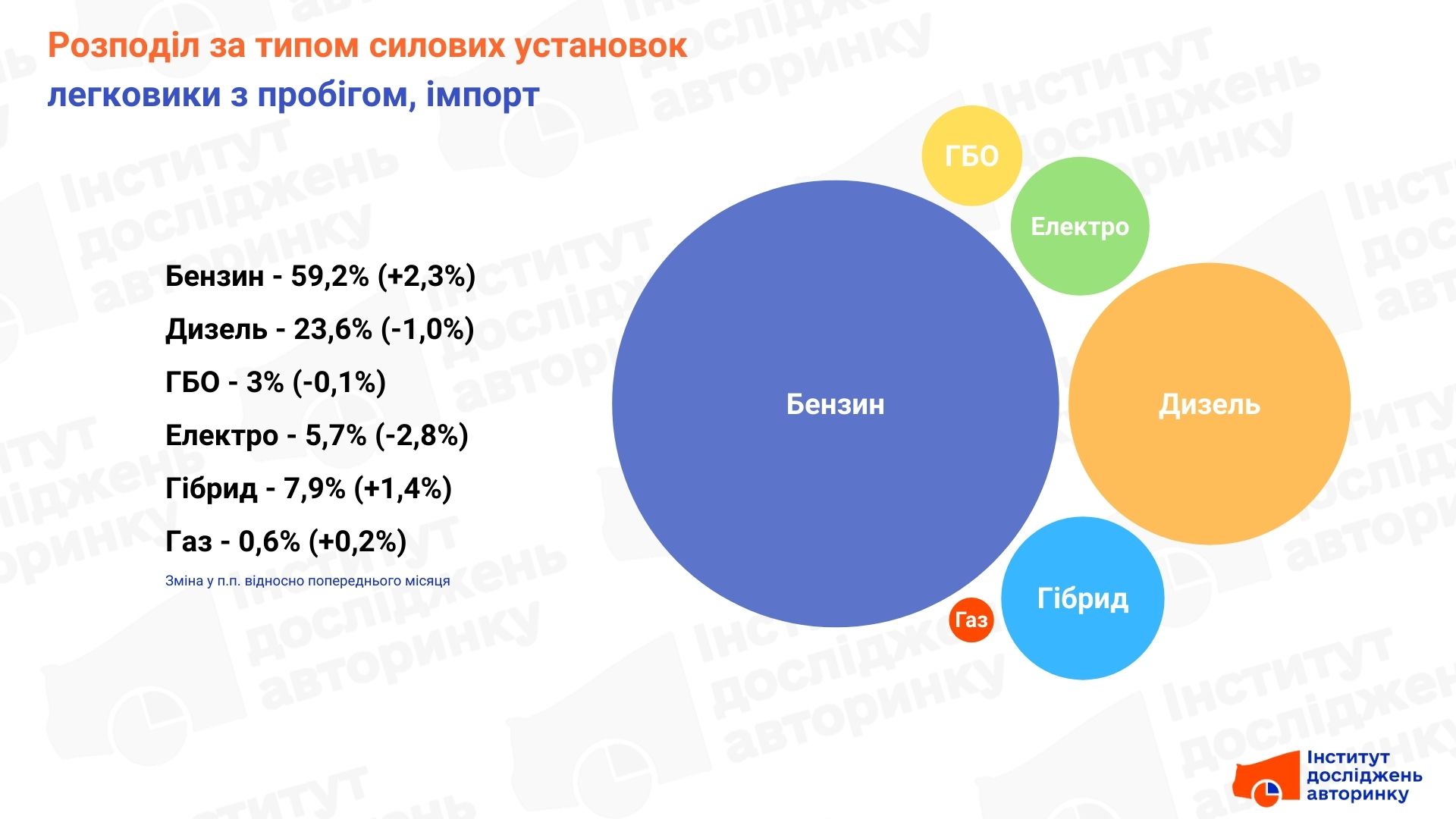 Бензинові авто суттєво зміцнили свої позиції, ставши головним вибором у списках пригону. Цікаво, що на фоні падіння частки електромобілів почав зростати інтерес до гібридних моделей. Це виглядає як логічна адаптація: люди, які вже звикли до ідеї економії та сучасних технологій, але не готові переплачувати ПДВ за чисту електрику, обирають «золоту середину». Дизель у цьому сегменті трохи втратив частку, але залишається важливою частиною імпортного потоку.