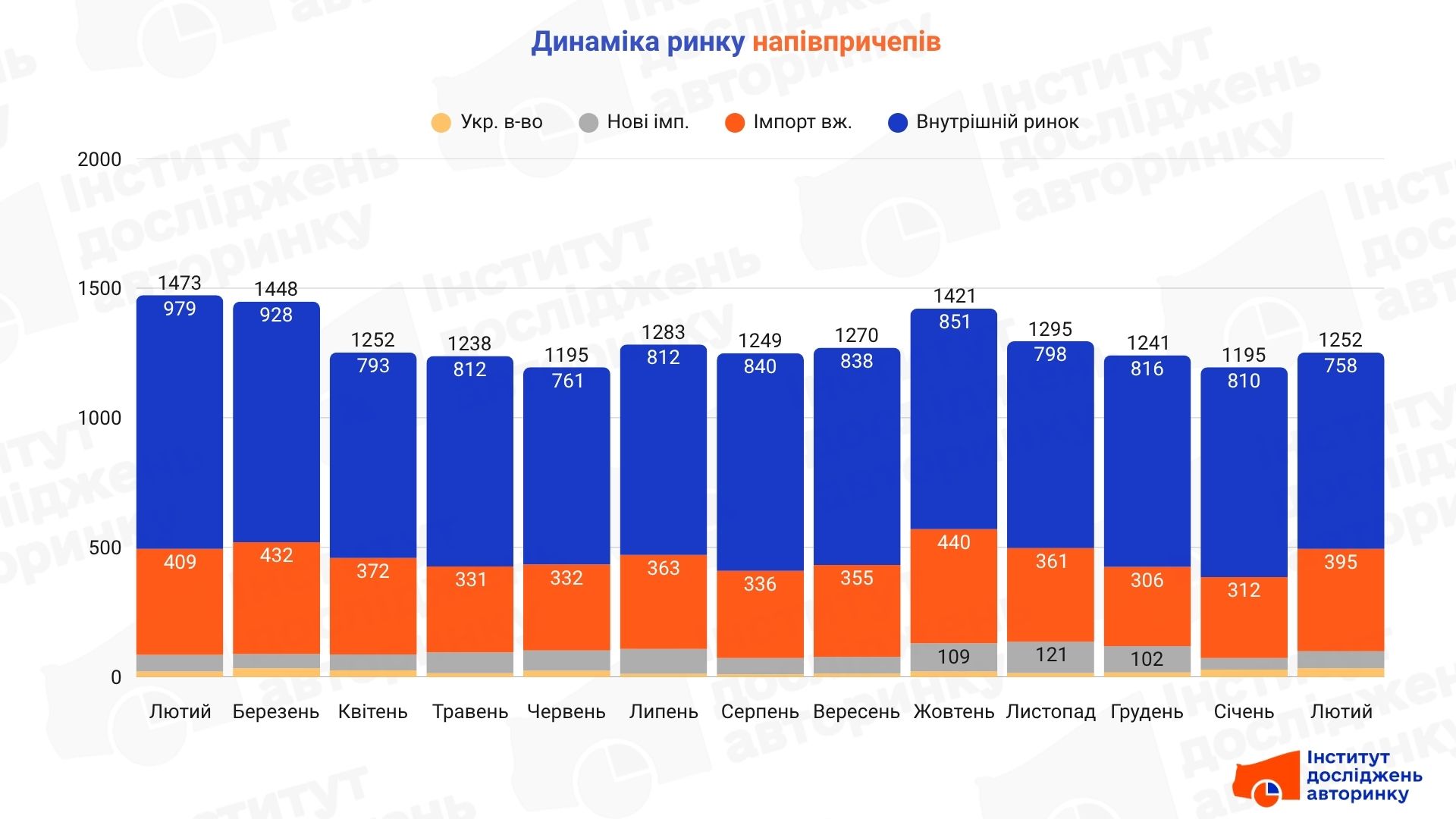 Лютнева статистика ринку напівпричепів відображає структурні зміни в українській логістиці. Попри загальне скорочення активності порівняно з минулим роком, окремі сектори демонструють динаміку, яка суттєво відрізняється від трендів у сегменті тягачів. Загалом протягом місяця було зафіксовано 1252 реєстраційні дії, що вказує на поступове відновлення попиту на оновлення парків після зимового затишшя.