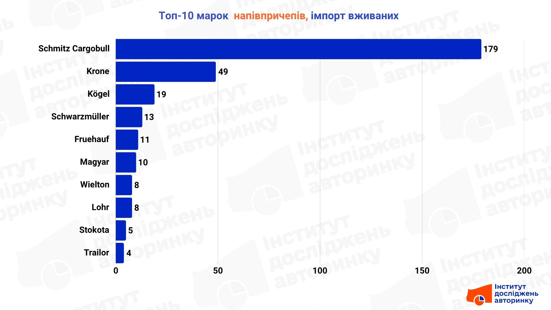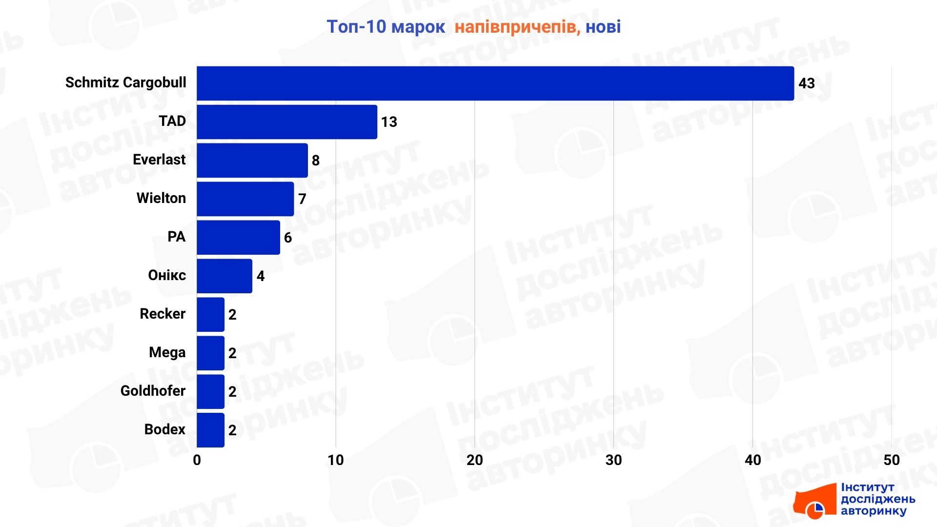 У списку брендів зберігається абсолютна домінація німецької «великої трійки». Беззаперечним лідером залишається марка, частка якої майже вдвічі перевищує показники найближчого конкурента. Також на внутрішньому ринку стабільно тримаються турецькі та польські виробники спецтехніки, особливо в сегментах цистерн та напівпричепів-самосвалів. Загалом цей сегмент зараз виглядає як процес вимивання старого парку, який дедалі частіше замінюється імпортним ресурсом.