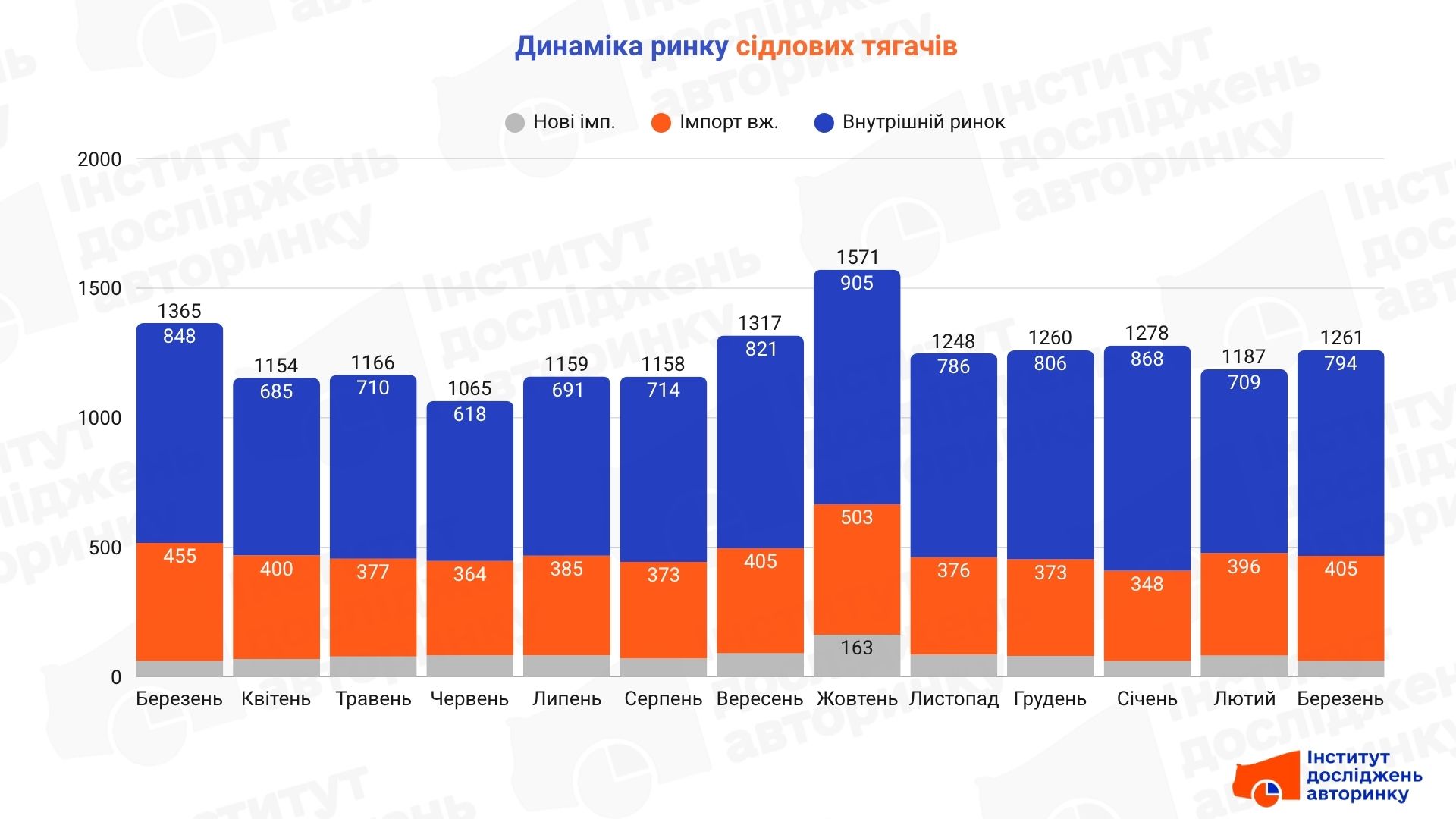 Загальна активність у сегменті тягачів залишається низькою порівняно з минулим роком. Головний маркер березня — падіння темпів оновлення парку новими машинами та стагнація імпорту вживаної техніки. Логістичний бізнес явно взяв паузу, намагаючись адаптувати свої тарифи до нових реалій АЗС. Сумарно за місяць у трьох сегментах було зареєстровано 1 261 тягач.
