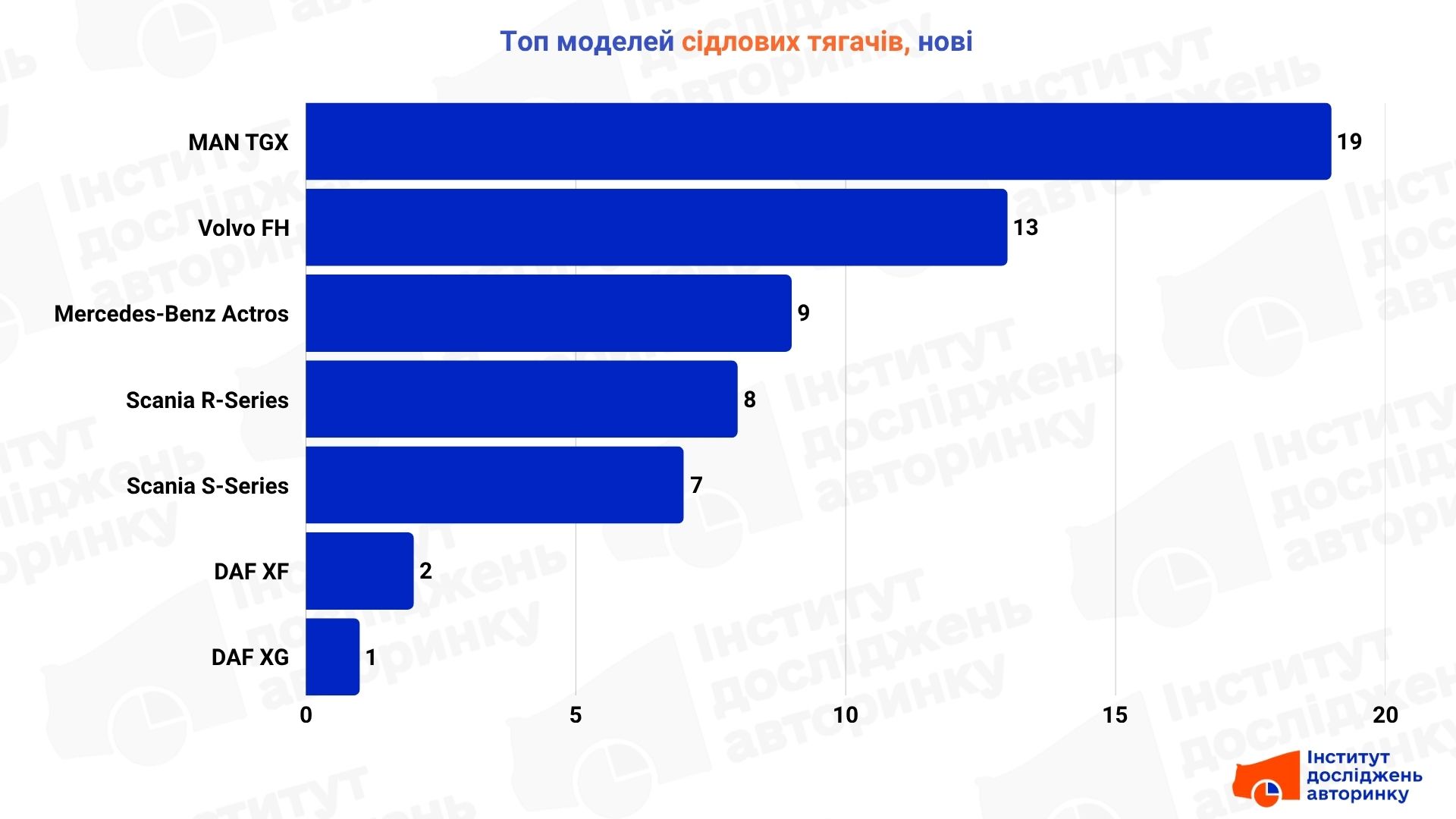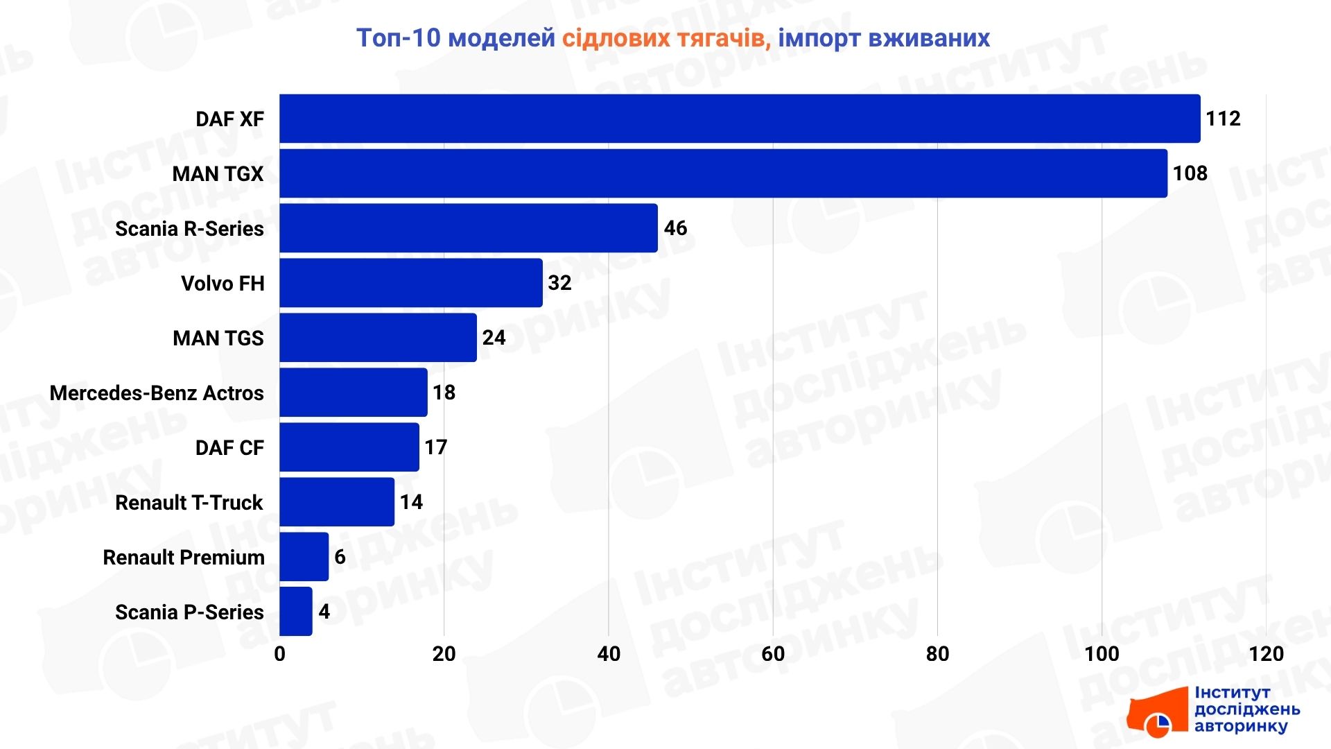 У структурі імпорту боротьба між DAF XF та MAN TGX йде майже на рівних — різниця лише у кілька одиниць. Третю позицію тримає Scania R-Series, яку обирають ті, для кого паливна ефективність на великих дистанціях є критичною. Загалом імпортний топ складається виключно з «великої європейської сімки», що підкреслює: надійність та можливість швидкого ремонту зараз важать більше, ніж початкова ціна.