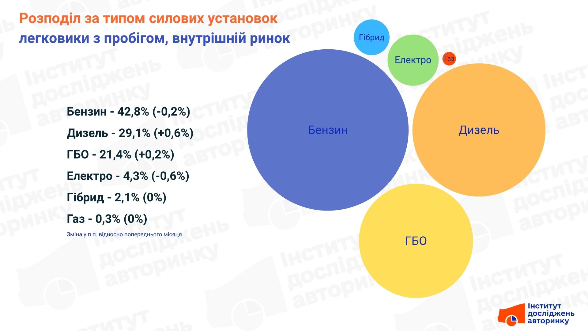 На ринку внутрішніх перепродажів домінують автомобілі з традиційними двигунами внутрішнього згоряння. Бензинові авто займають понад 42% ринку. Найбільше зростання у жовтні продемонстрував дизель. Водночас частка електромобілів, які тут переважно представлені старішими моделями, дещо скоротилася.