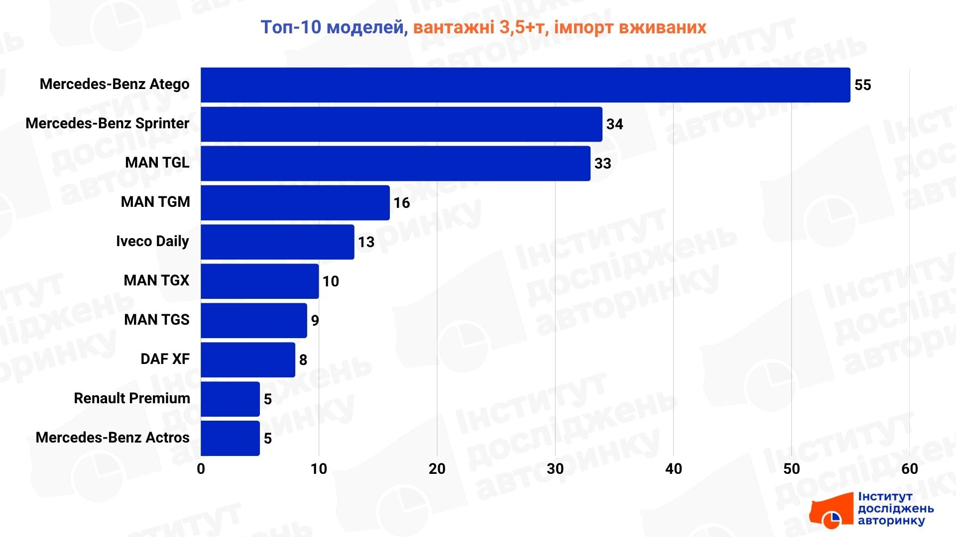 Найбільший попит у жовтні був на Mercedes-Benz: лідерство утримує Mercedes-Benz Atego (55 од.), за ним іде Sprinter (34 од.). Потужно виглядають позиції MAN: модель TGL (33 од.) посіла третє місце, доповнюють її TGM (16 од.), а також контейнеровози TGX (10 од.) та будівельні TGS (9 од.).