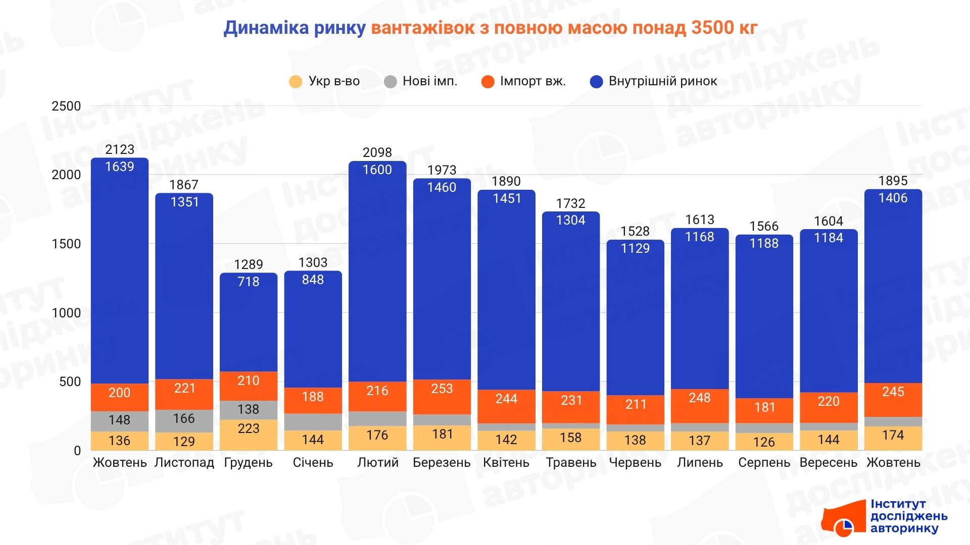 Обсяг ринку вантажних авто з повною масою понад 3500 кг за підсумками жовтня 2025 року склав 1895 шт. У порівнянні з вереснем цього ж року це на 18,1% більше, але на 10,7% менше відносно результатів жовтня 2024 року. Щомісячні обсяги наведені на діаграмі.