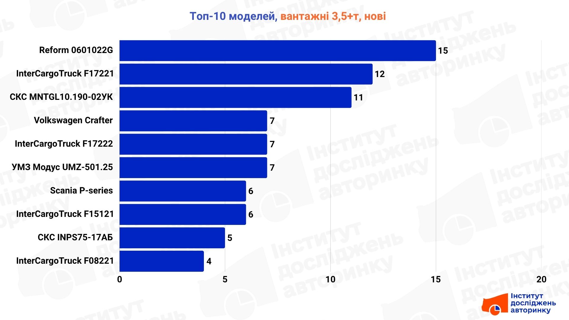 Йдеться про фургони, рефрижератори або спецтехніку, що встановлюється на імпортні шасі. Саме тому ми бачимо в лідерах такі назви, як Reform 0601022G (15 од.) та InterCargoTruck, який зайняв одразу чотири позиції в рейтингу (F17221, F17222, F15121, F08221).