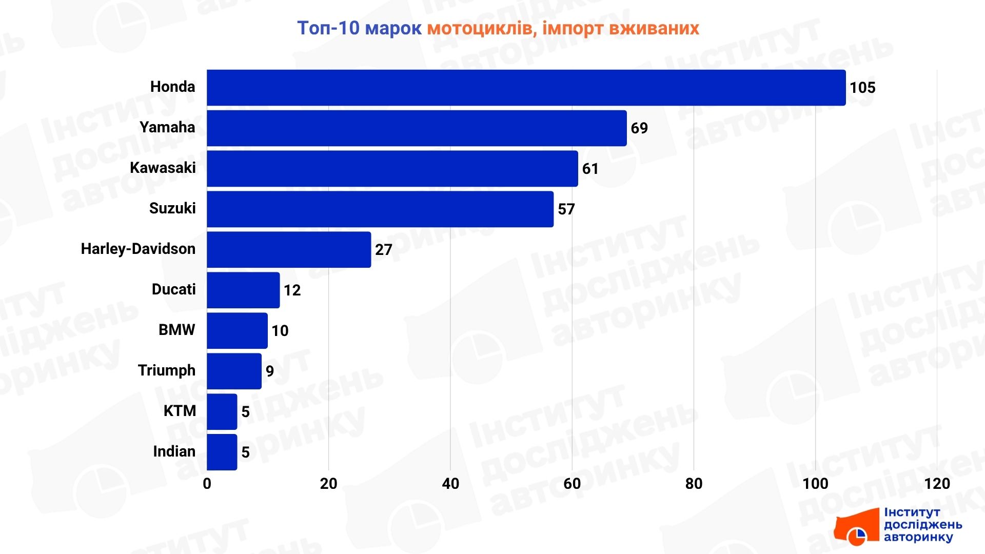 Експерти Інституту досліджень авторинку проаналізували статистику реєстрацій мототранспорту, й визначили найпопулярніші марки у трьох сегментах: імпорті вживаних, внутрішніх перепродажах та серед нових мотоциклів.
