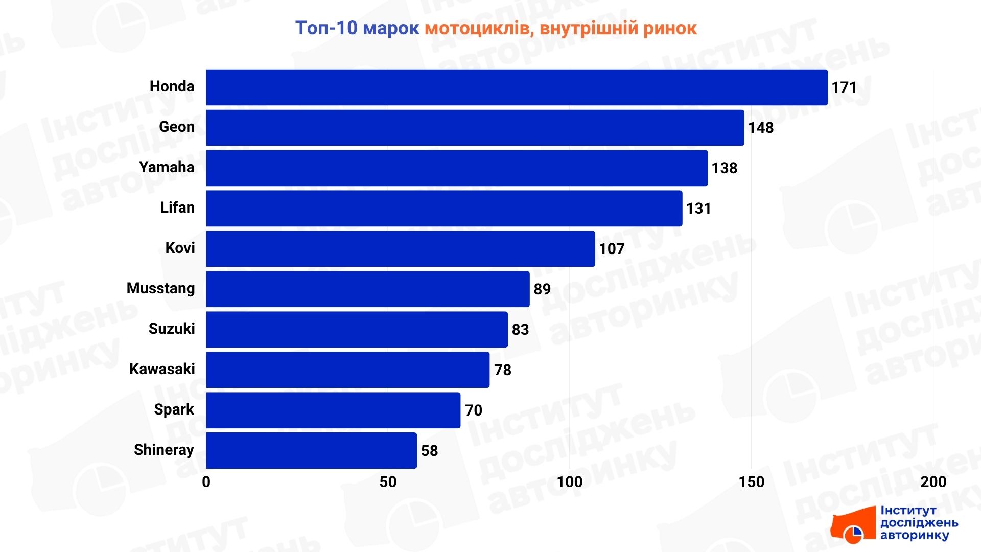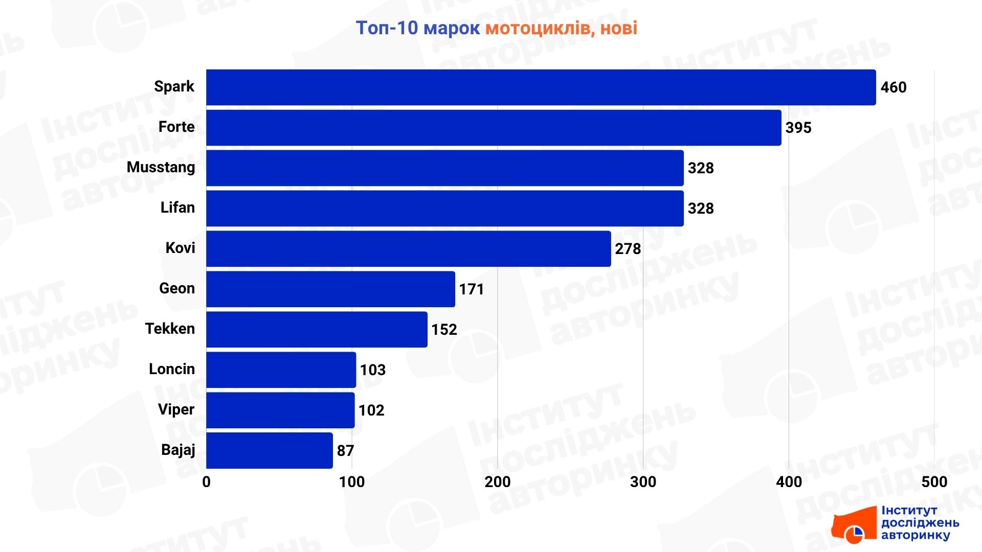 У топі продажів домінують бренди, що пропонують максимально доступну техніку: Spark, Forte, Musstang, Lifan та Kovi. Також високі позиції займають Geon, Tekken, Loncin та Viper. Єдиний представник Індії у першій десятці — Bajaj — також грає у бюджетному сегменті.
