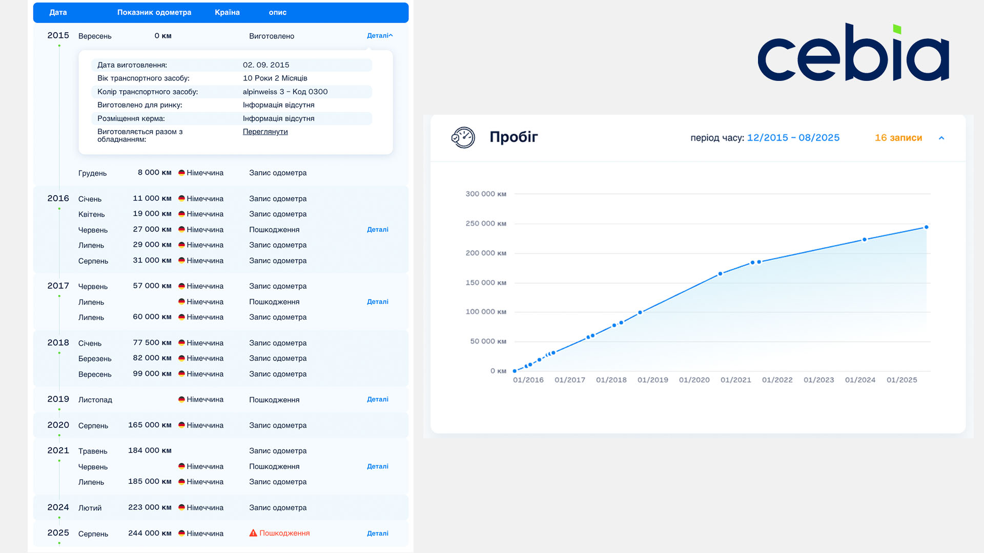 Також у звітах Cebia є інформація про те, що не менше хвилює покупців — «бита чи не бита», тобто чи бувала машина в ДТП. Якщо так — ви дізнаєтесь наскільки сильними були пошкодження, в яку суму був оцінений ремонт, а подекуди навіть отримаєте фото автомобіля з цими пошкодженнями.