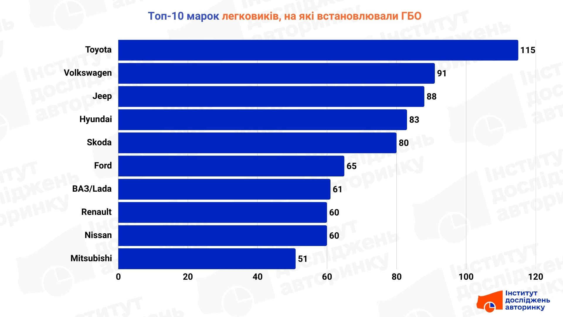 Рейтинги марок, які найчастіше переобладнували у жовтні 2025 року для роботи на двох видах пального, включаючи зріджену суміш пропан-бутану, демонструють вже звиклий мікс зі старих європейців та автівок з американського ринку, де ще подекуди можна віднайти «атмосферні» мотори, для яких ГБО у наших реаліях не просто засіб економії, а єдина можливість мати витрати на пальне в рамках розумного. Бо в іншому разі, ще й попри електромобілі, експлуатація бензинового двигуна об’ємом понад 2,5...3 л стає економічно недоцільною. Між «американцями» (куди потрапляє частина машин від Toyota, Volkswagen, Ford, Nissan, Jeep, Hyundai та Mitsuishi), є кілька європейських марок — Skoda ранніх випусків, до епохи TSI, та Renault, до насичення лінійки моторами TCE.