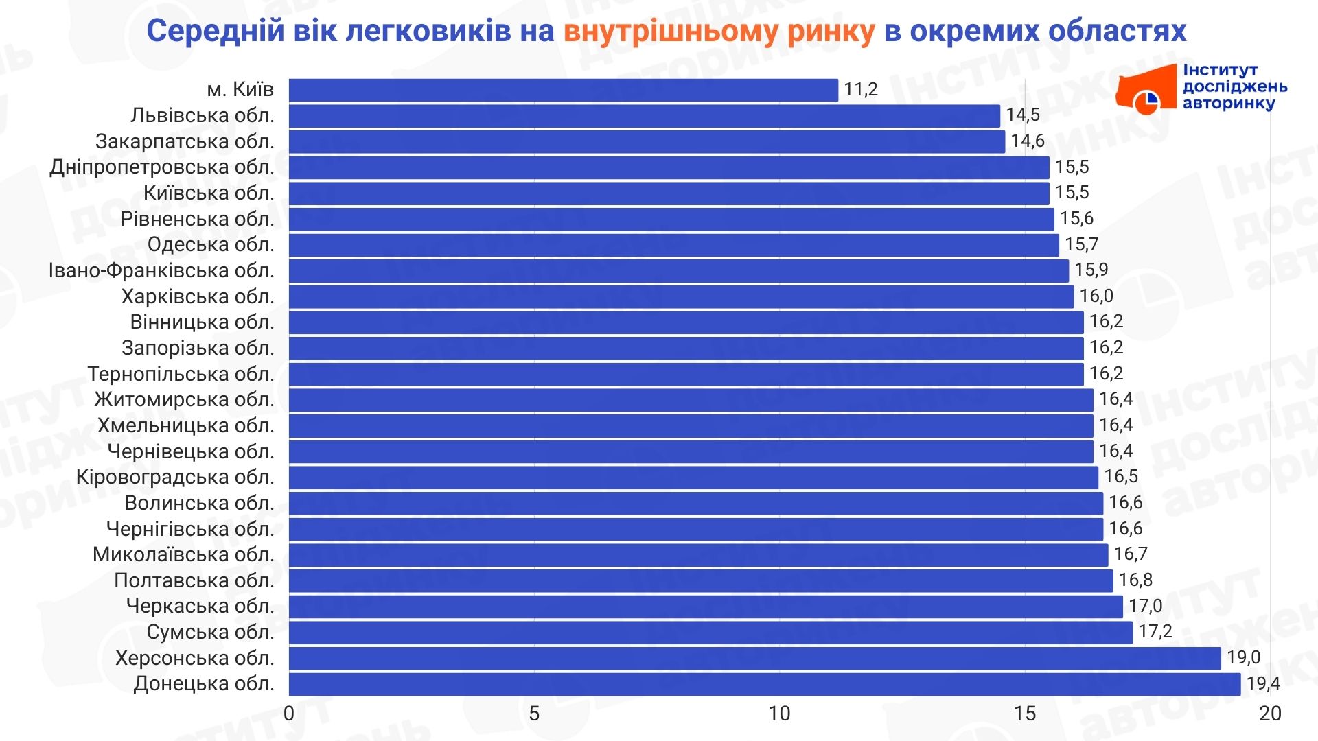 Найстаріший автопарк, як і раніше, зафіксовано у регіонах, де економіка та безпека залишаються найбільшими викликами. Антирекордсменами є Донецька (19,4 року) та Херсонська (19,0 року) області.