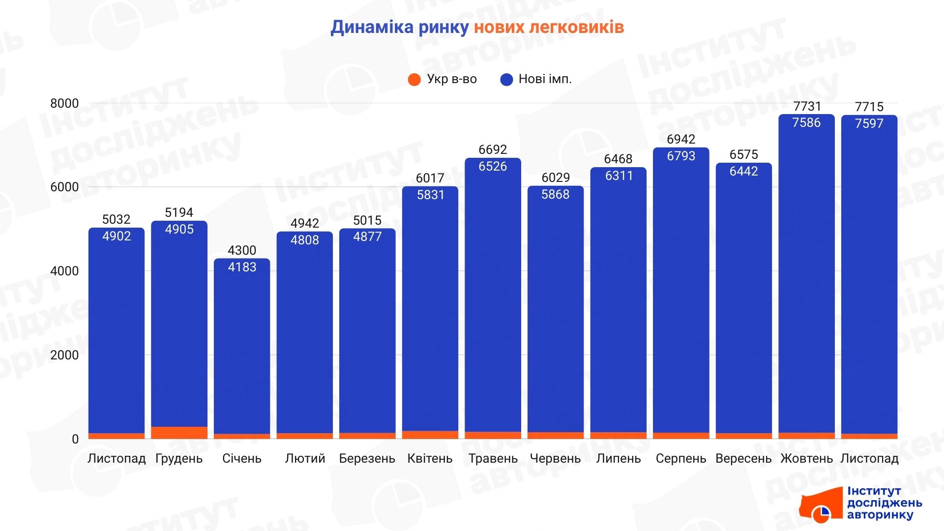 Впродовж листопада 2025 року українці та місцеві підприємства придбали 7,7 тисячі нових легковиків. У річному порівнянні з листопадом 2024 року маємо збільшення обсягів на 53,3%, а коли рівняти цьогорічний листопад до жовтня — отримуємо невелике зменшення, всього на 0,2%.
