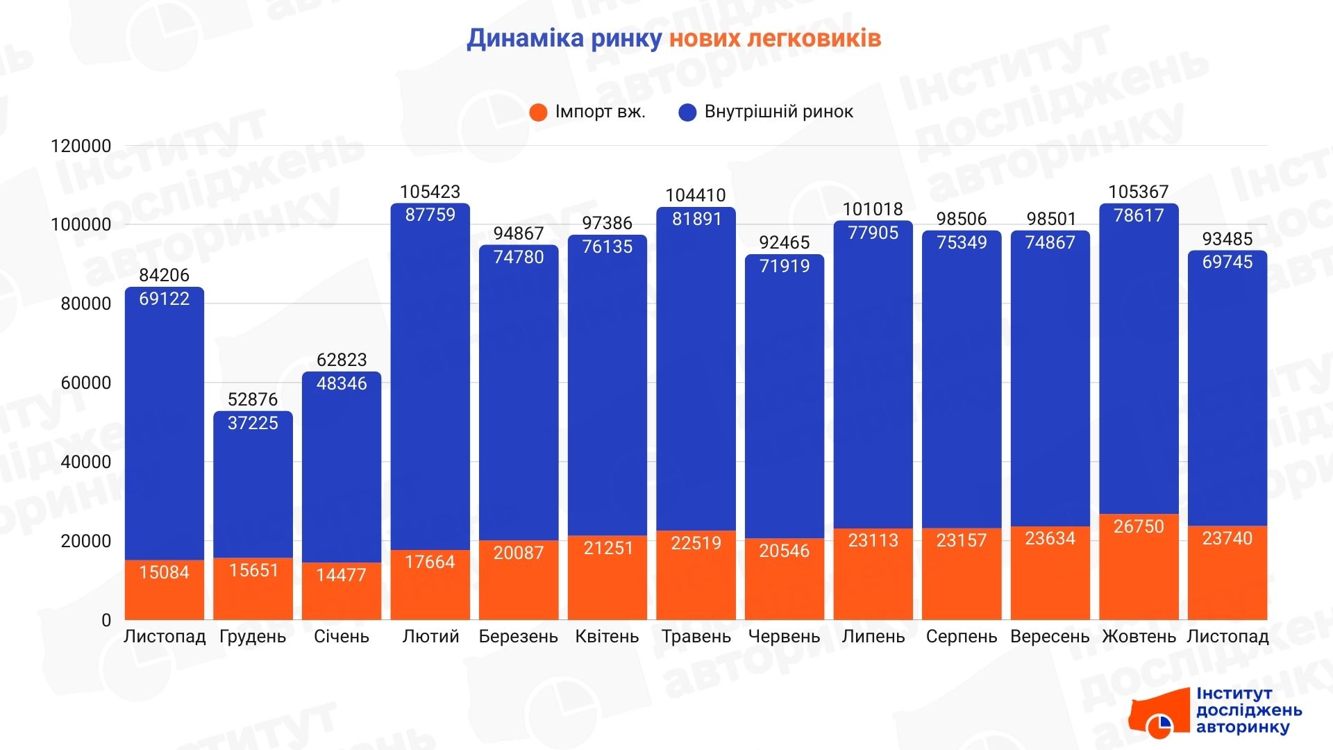 Сумарно українці придбали 93 485 вживаних легковиків (сума внутрішніх угод та імпорту). Це помітний крок назад порівняно з жовтневим піком (понад 105 тисяч), проте, якщо дивитися на картину ширше, ринок почувається значно впевненіше, ніж рік тому.
