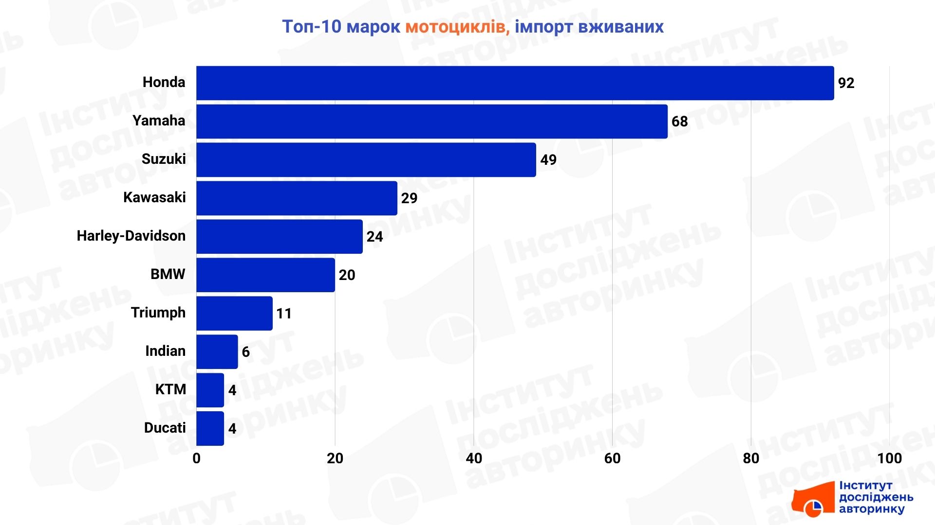 На відміну від внутрішнього ринку та сегмента нових, тут панують світові гранди індустрії. Китайських брендів у цьому списку немає. Лідирують Honda, Yamaha та Suzuki. Також помітний попит на преміальну та важку техніку: в топі присутні Kawasaki, Harley-Davidson, BMW та Triumph. Це свідчить про те, що фанати мотокультури використовують кінець року для купівлі техніки «для душі» за, ймовірно, вигіднішими цінами на аукціонах у міжсезоння.