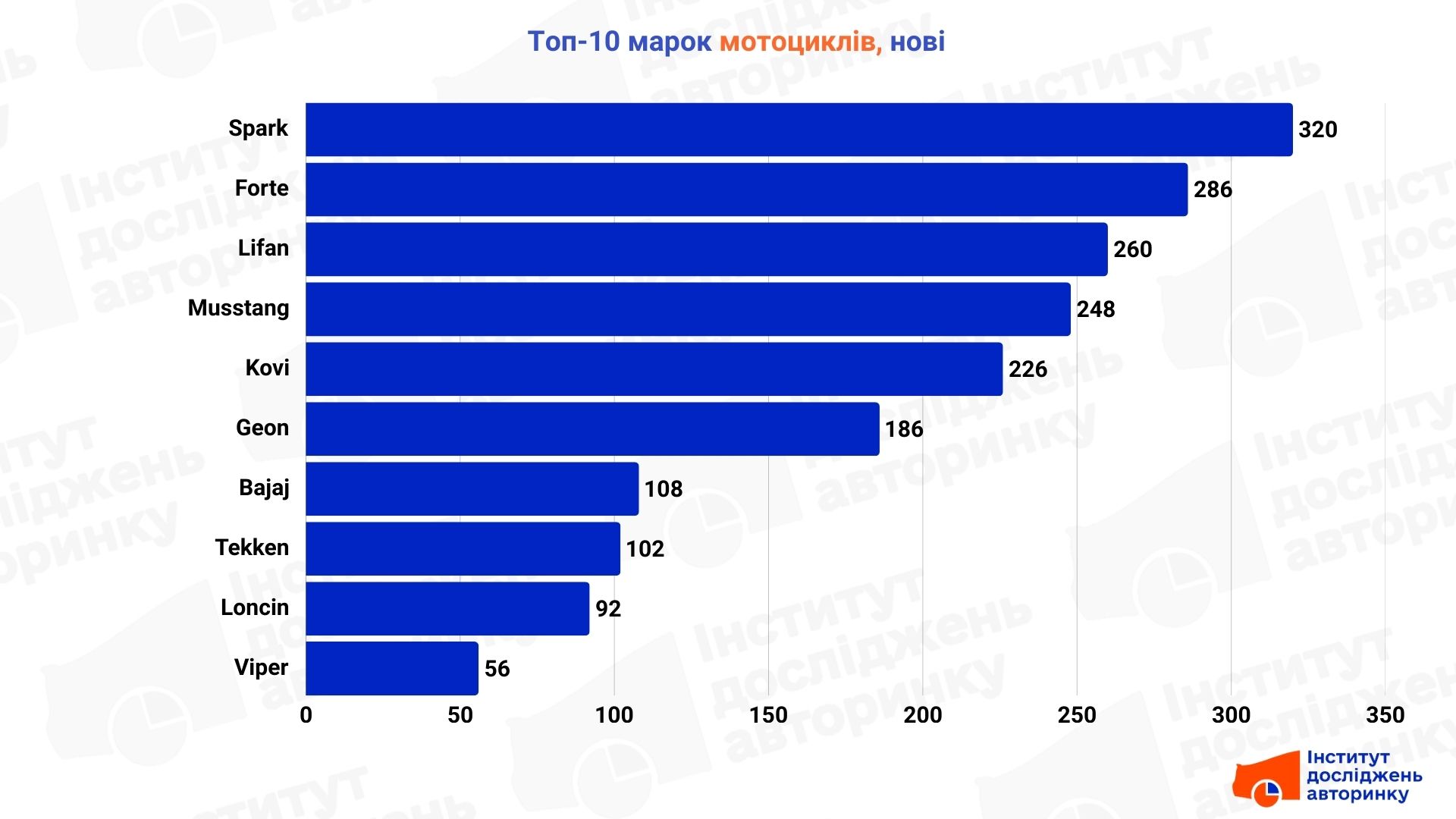 Структура продажів нових байків безальтернативна: ринок повністю належить виробникам з Китаю та Індії. Лідером місяця став бренд Spark, за ним розташувалися Forte та Lifan. Також у топі популярних — Musstang, Kovi та індійський Bajaj. Українці голосують гаманцем за максимально доступну, просту в обслуговуванні та утилітарну техніку.