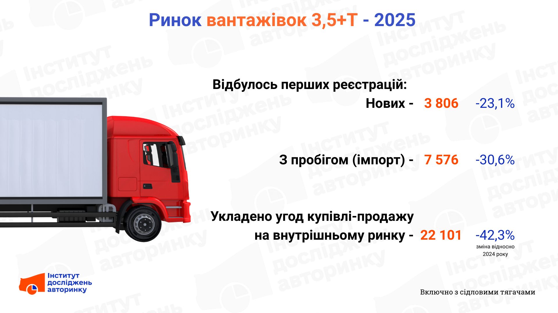 У цьому розділі ми підіб’ємо підсумки для всіх вантажівок з повною масою понад 3,5 тонни, включно з сідловими тягачами, які зазвичай ми оглядаємо окремо (як і напівпричепи для них). І тут маємо набір з трьох мінусів: посіли усі підсегменти цієї частини авторинку. Менше, на 23% (у порівнянні з 2024 роком) куплено нових вантажівок, на 31% «свіжопригнаних», та на 42% менше укладено угод купівлі продажів на «вторинці». Сегмент впевнено стагнує, і це, нагадаємо, не причина, а наслідок.