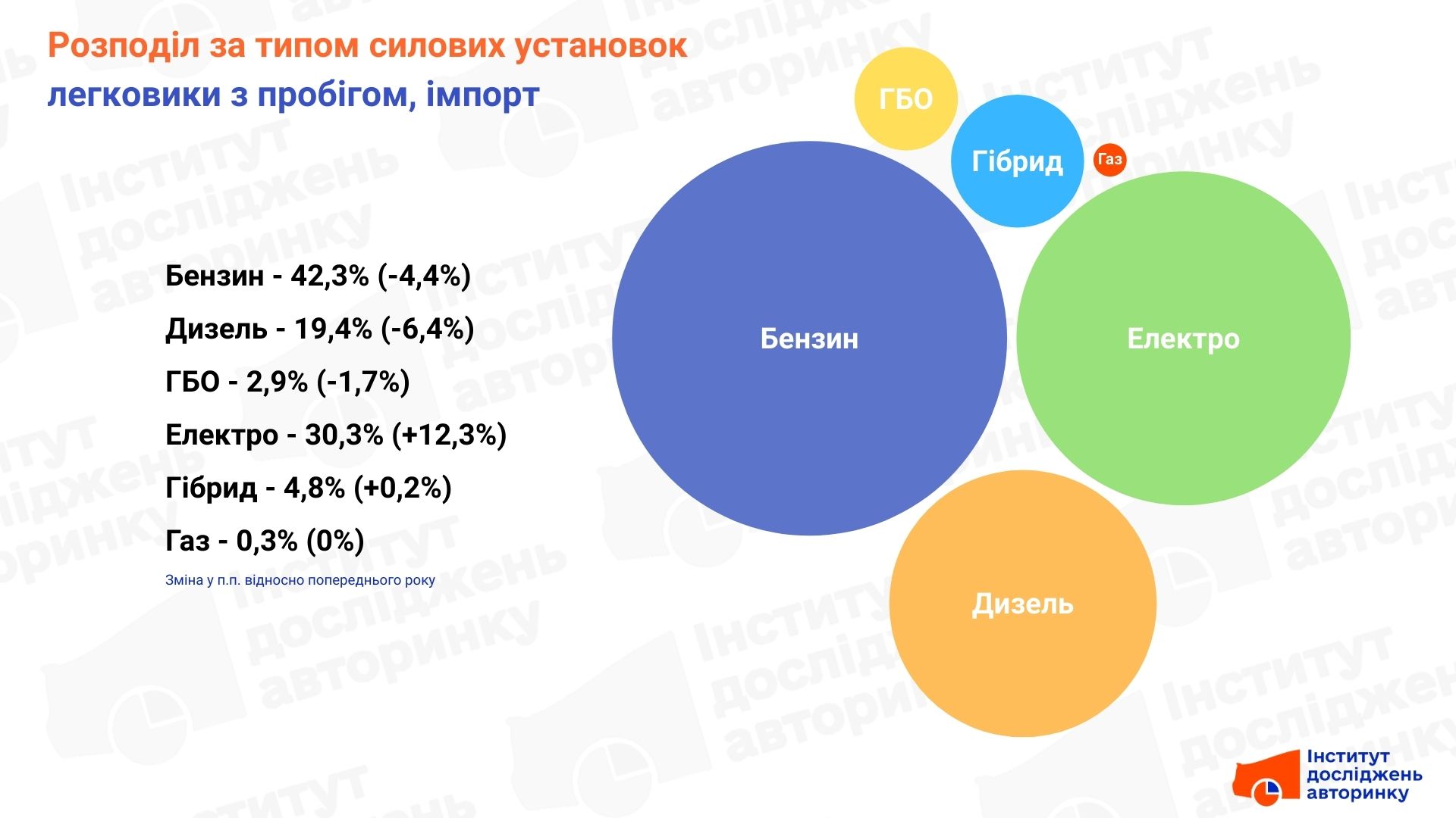 - Електро-бум. Частка електромобілів злетіла до 30,3%, додавши за рік неймовірні 12,3%. Тепер кожен третій вживаний легковик, що заїжджає в Україну — на батарейках.