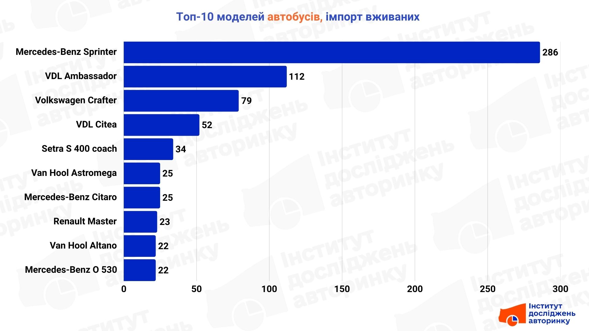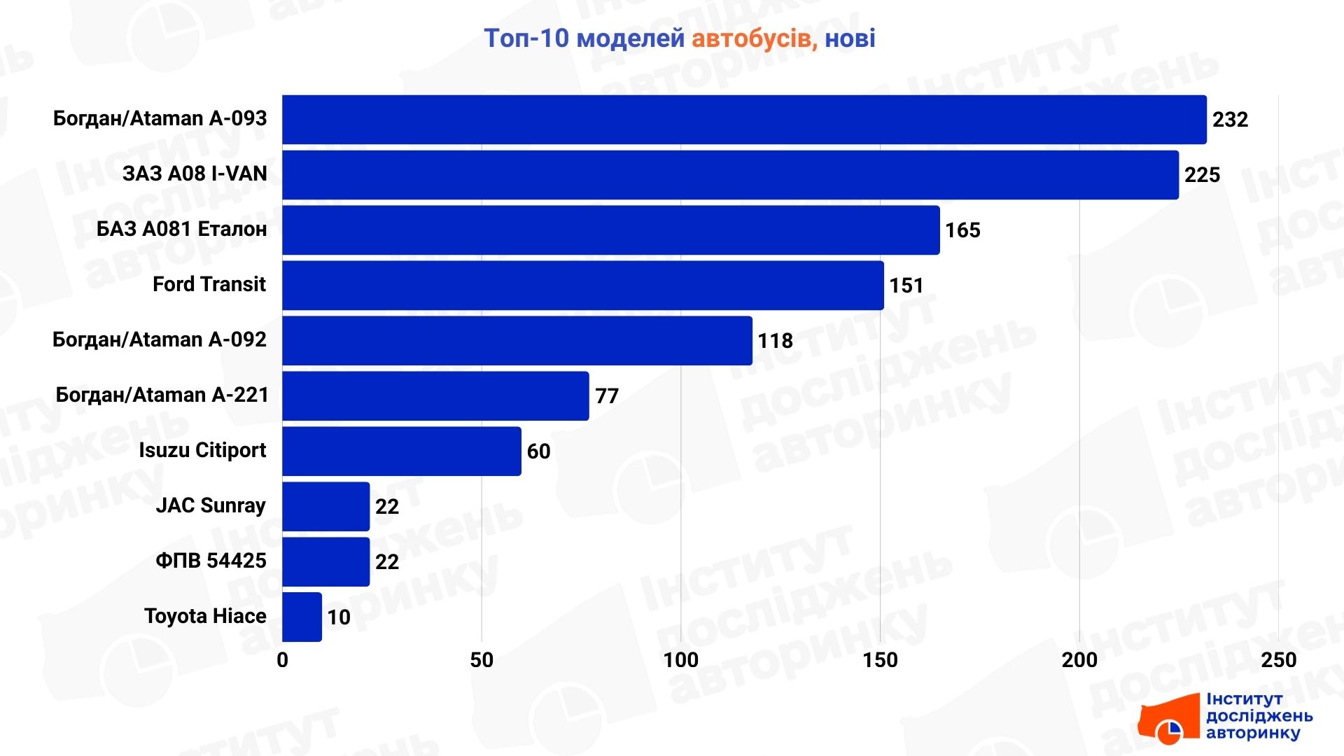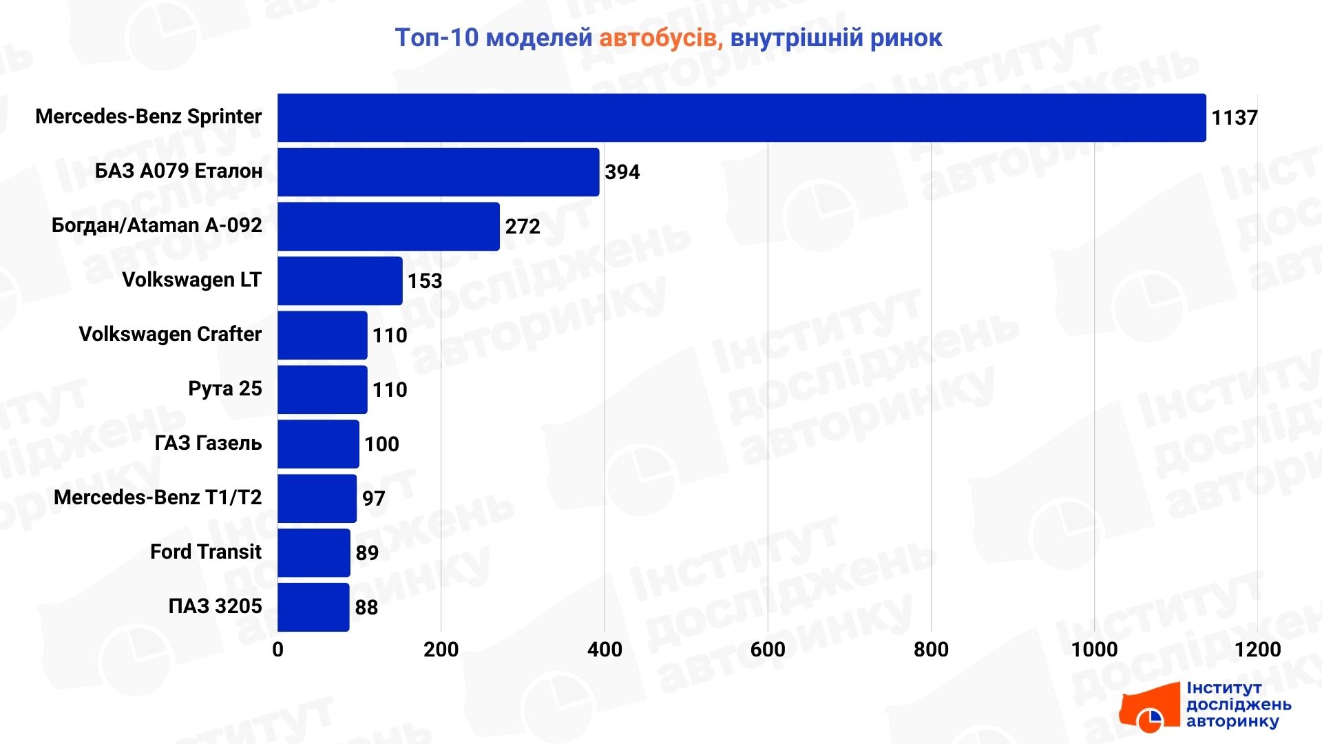 Тут панує Mercedes-Benz Sprinter — абсолютний лідер за кількістю угод. Поруч із ним тримаються українські БАЗ А079 Еталон та Богдан/Ataman А-092.