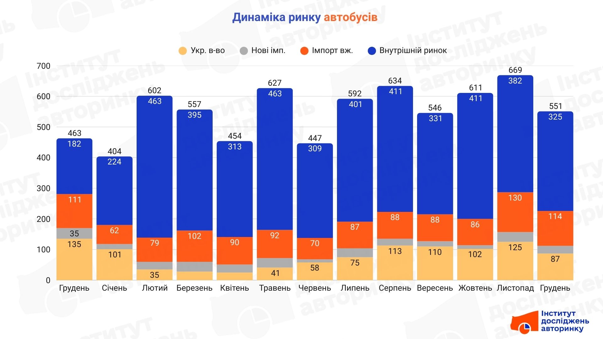 Сумарно останнього місяця 2025 року було укладено 325 угод купівлі-продажу на внутрішньому ринку, здійснено 114 перших реєстрацій вживаних автобусів, та 112 нових (з чого 25 машин були імпортними, 87 виробленими в Україні).