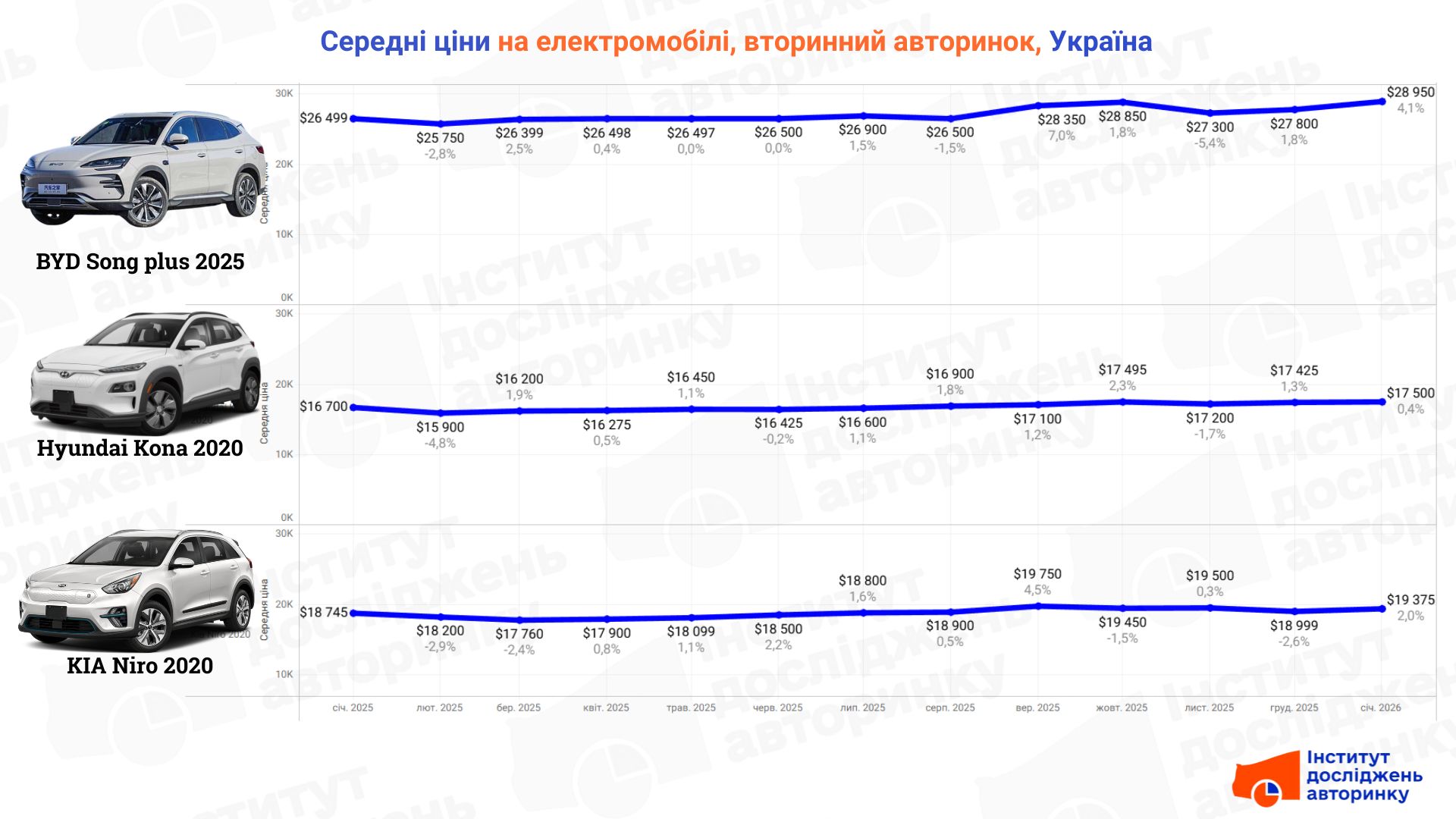 - Kia Niro (2020): Продемонструвала коливання, але в підсумку закріпилася на рівні $19 375.