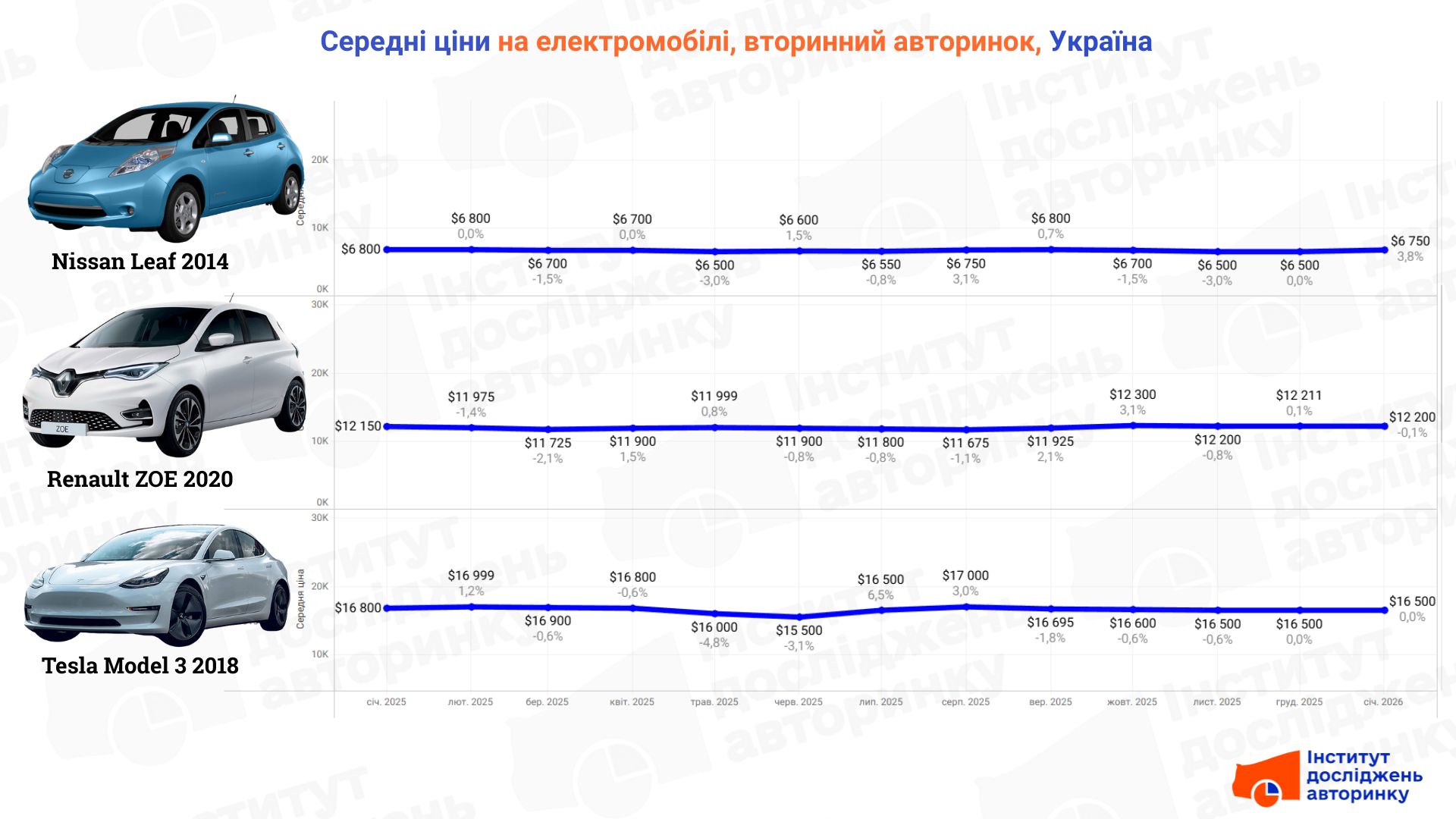 Далі - зміна середніх (медіанних) цін на топ-10 найпопулярніших на ринку електромобілів, з урахуванням наймасовішого року випуску для кожної, але без врахування конкретної версії чи комплектації. Однак такі дані можна замовити в Інституту досліджень авторинку.