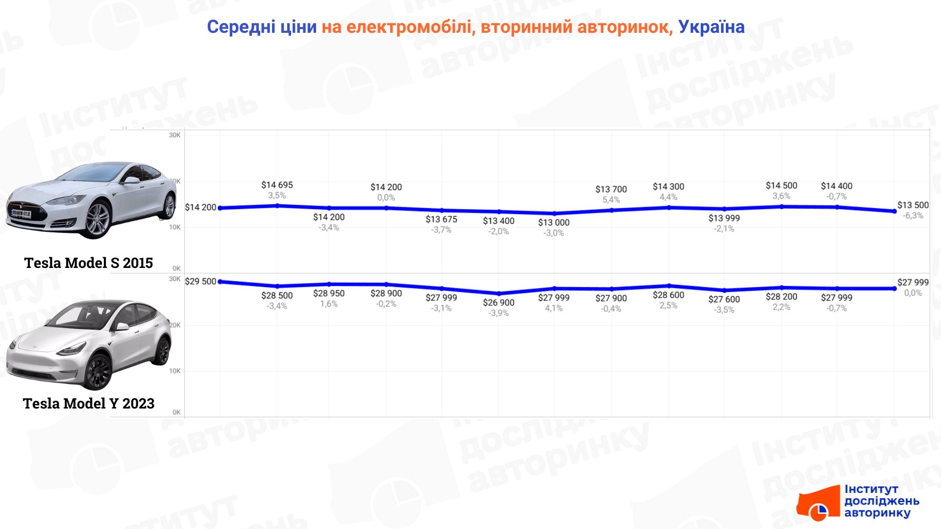 - Model Y (2023): Найстабільніша ціна — $28 000. Оновлення Juniper не викликало обвалу цін на попередню версію.