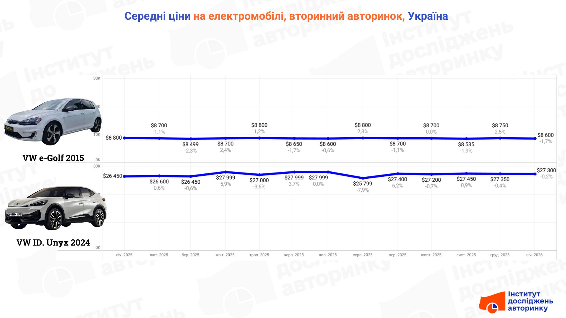 - VW ID.Unyx (2024): Новий фаворит, що витісняє ID.4. Ціна піднялася до $27 300. Модель забирають «з коліс», часто навіть не доводячи до оголошень.
